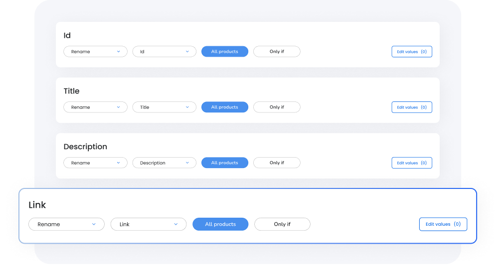 Enhance your product visibility with powerful dynamic rules. Use our modifiers to combine, rename, or add data based on specific conditions, optimizing performance with minimal effort.